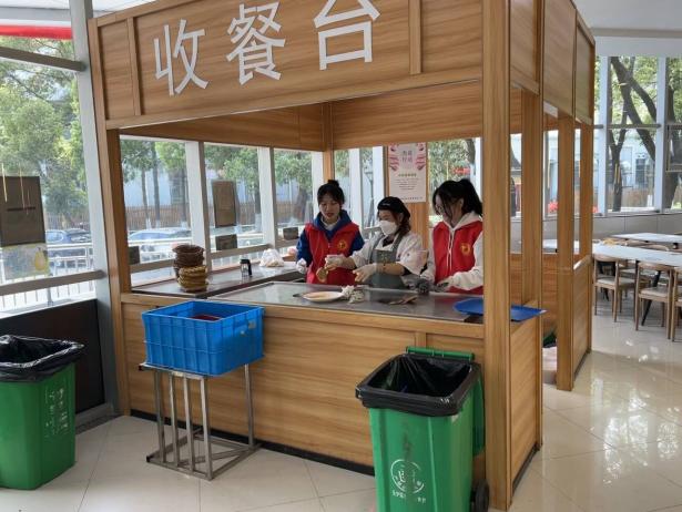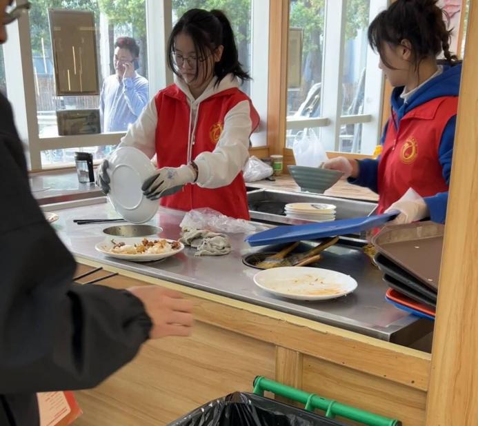孙宇晴、周慧两位同学看着食堂阿姨熟练娴熟地将餐盘中剩菜剩饭、筷子、纸巾等垃圾分类清理好,心里很是佩服。面对一波又一波学生送来的餐盘,她们显得有点手忙脚乱,和食堂阿姨的从容麻利形成鲜明对比。1小时的换岗体验让她们深深感受到了食堂阿姨的辛苦和不易,也更加意识到节约粮食的重要性。