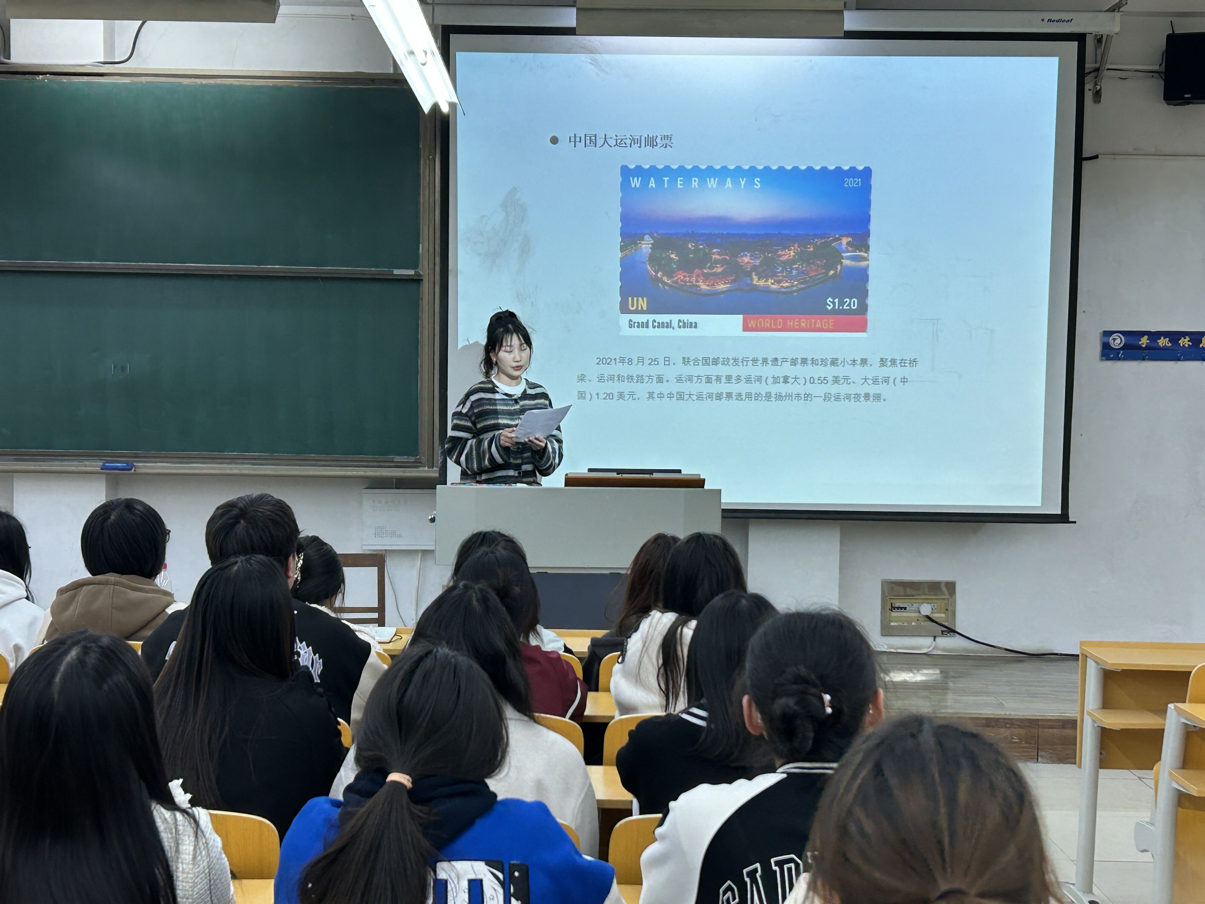 “运河邮事”,讲述邮票上的运河故事。“邮票中的大运河,虽年岁久远,却又青春正盛。2021年8月25日,联合国发行的《2021世界遗产——桥梁、运河和铁路》邮票和珍藏小本票中,中国大运河邮票选用的便是江苏扬州市的一段运河夜景照。”邮之声志愿队队员孙宇晴向入党积极分子们讲述着邮票上的运河故事。她向同学们介绍了“中国大运河邮票”“小型张‘千里通波’邮票”“《中国古代科学家》(第二组)纪念邮票——郭守敬”等。她生动地讲述着运河文化的底蕴和内涵,引起了同学们的浓厚兴趣和热烈反响。