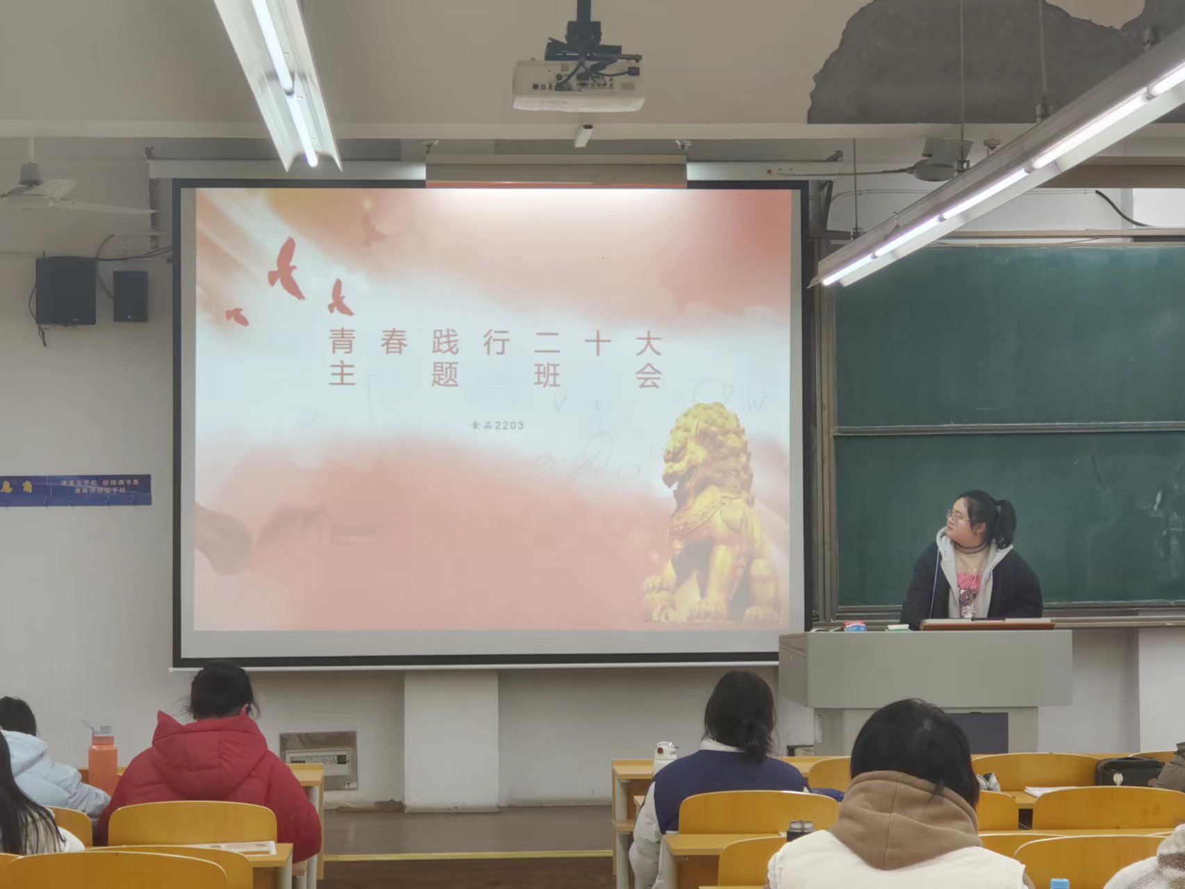 化工2201、食品2201、食品2203等班级围绕“学生心理健康”、“解读二十大精神”、“互动交流成长经历”等内容开展主题班会,引导学生深入贯彻党的二十大精神,激扬青春梦想,奋进新时代;食品2101、食品2102、药技2101、药技2102班围绕“爱国、团结、奋斗、科学、互助”五个关键词,分享践行党的二十大精神,并重点强调了学生的安全问题,引导学生提高安全警惕意识,做好自身安全的第一责任人;食品2202班以“家国情怀”为切入点开展主题班会,并邀请学生干部作了题为“中国青年”的主题演讲。药技2203班邀请了20级学生党员王思懿分享个人学习、生活经验,通过朋辈对话的形式,生动展示了当代青年将“小我”成长融入“大我”奋斗之中的先进事迹和青春风采;化工2201班向学生分享林俊德同志的英雄事迹,用他的献身事业的精神引导学生践行新时达大学生的责任担当,并向学生介绍了中国过去的十年发展史,通过举例让学生领悟过去十年的发展成就,明确跟党走、听党话的重要性。
