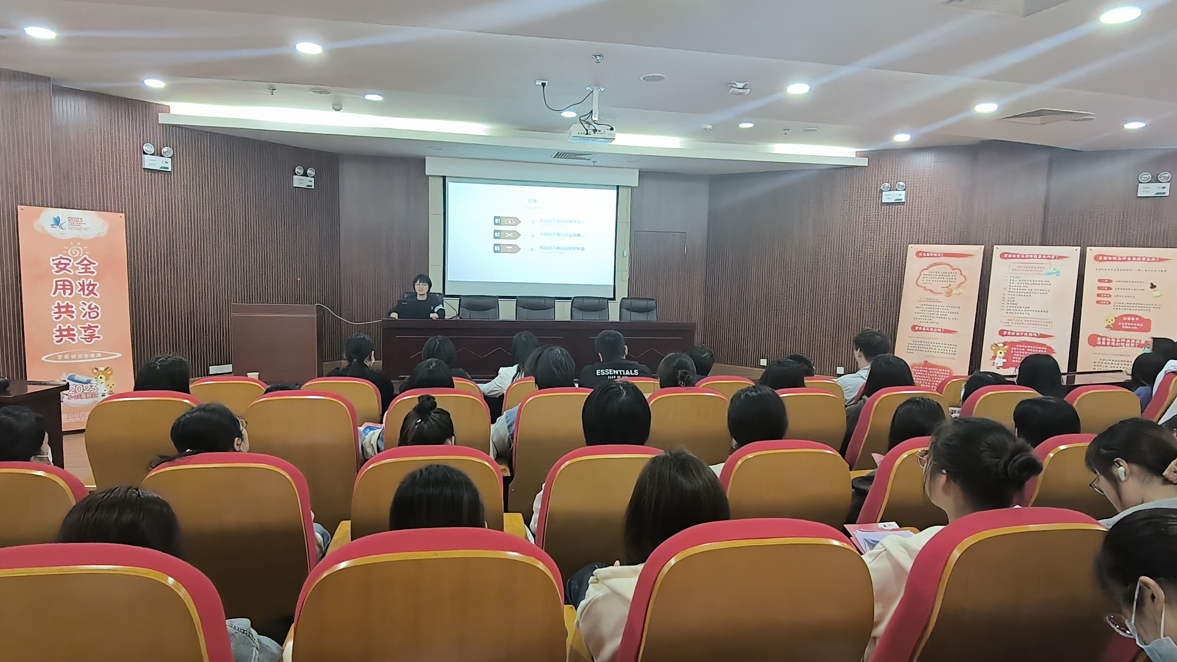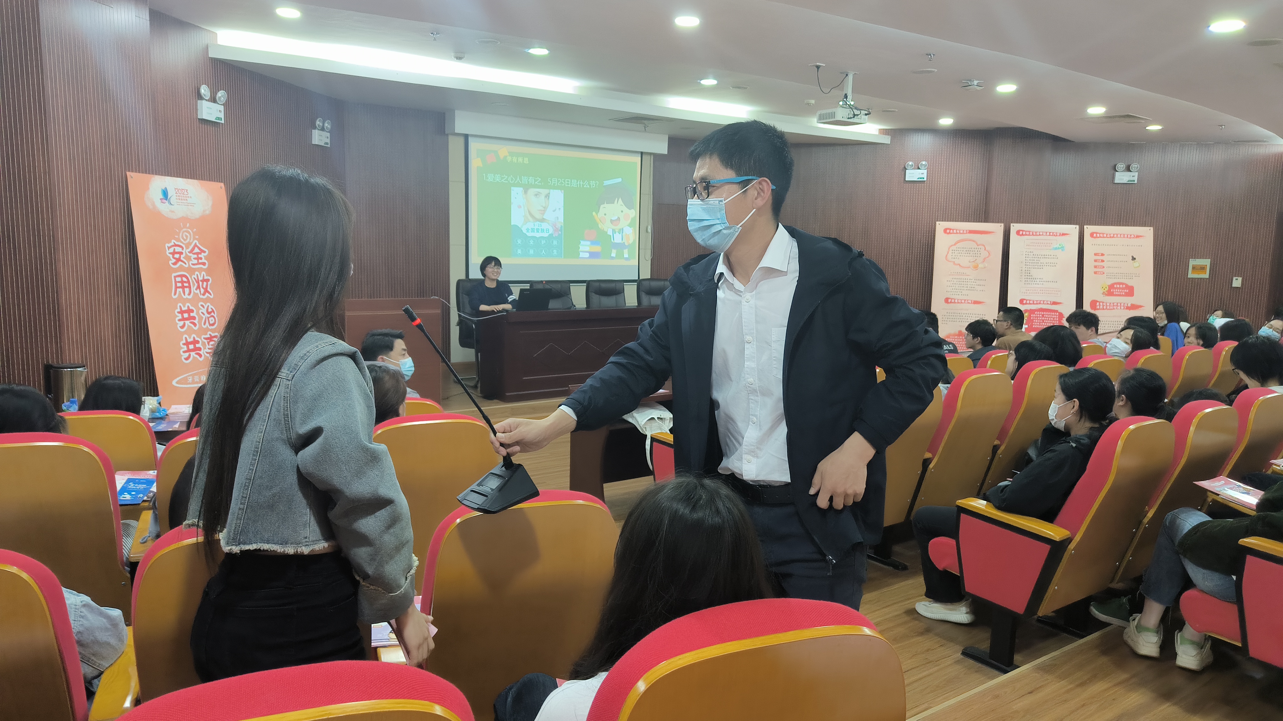 5月25日简称“我爱我”,是全国“爱肤日”。为向广大青年学生宣传安全用妆、健康护肤知识,学院联合省市药监局邀请了苏北人民医院赵莎医生、市药品不良反应监测中心杨婷婷两位专家进行宣讲、答疑,2位专家结合科普视频动画,为师生们介绍了化妆品定义、牙膏基本常识、不良反应判断和处理、化妆品正确选购等知识。