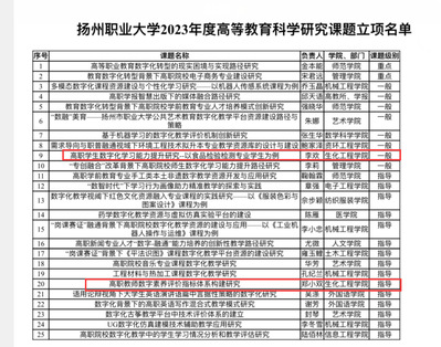 近日,我院李欢老师主持的《高职学生数字化学习能力提升研究——以食品检验检测专业学生为例》和郑小双老师主持的《高职教师数字素养评价指标体系构建研究》分别获得校2023年度高等教育科学研究课题立项。