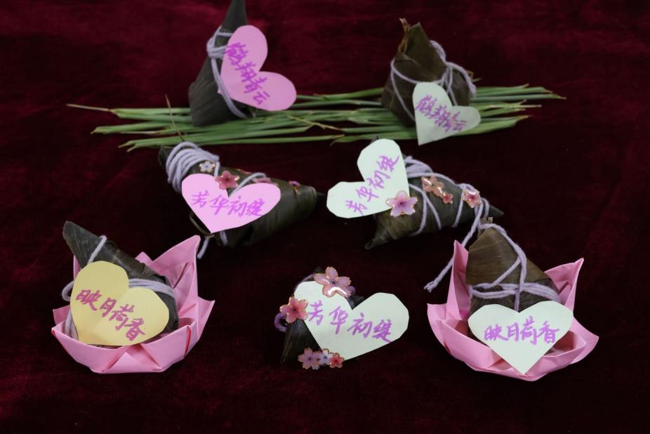 一张张翠绿的粽叶在同学们手中翩翩起舞,一个个独具特色的粽子在同学们手中诞生。只见“芳华初绽”樱花味的粽子上装饰着清新典雅的花瓣,“映月荷香”莲蓉味的粽子摆放在朵朵荷花之上,“鹤翔青云”抹茶味的粽子上挂着竹叶书签,心意满满,新意十足。