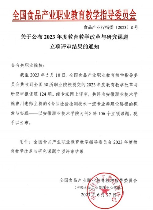 日前,2023年度全国食品工业职业教育教学指导委员会教学改革研究课题项目评审结果已揭晓,我院孙长花老师、马武生老师分别申报的《食品营养学课程思政资源开发的理论思考与实践》和《“以学生为中心”教学法中学生满意度研究和教学质量评价指标构建》两项课题均获得立项。