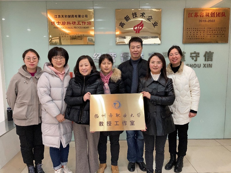 为响应国家关于加强学校和企业合作的号召,充分发挥市属高校在服务地方经济社会发展中的重要作用, 强化我校生物与化工工程学院科技创新团队为社会、为企业服务的功能,12月15日上午,生化学院党总支书记杨萍教授带领学院教授代表蒋建国教授、韦林洪教授,科技副总郭静老师及部分科技创新团队成员前往第四批江苏省产教融合试点企业——江苏天和制药有限公司,为教授工作站挂牌,天和药业副总杨南松、行政人事部部长王微出席了此次挂牌仪式。