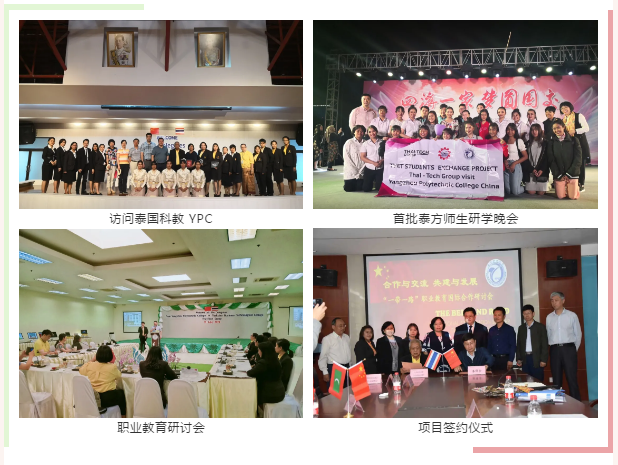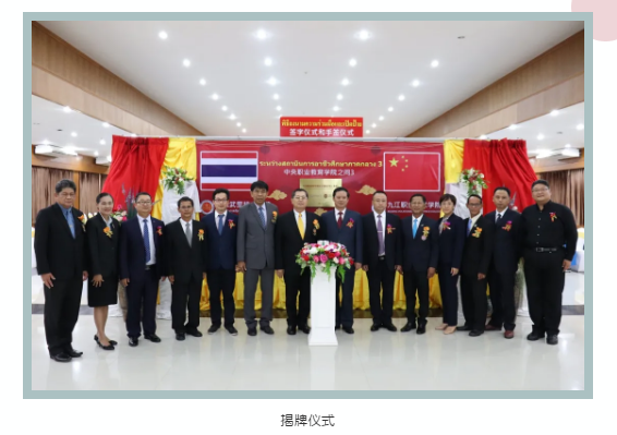 项目策应“一带一路”倡议,实施“援外示范”国际化行动,与泰国中部三区职教中心(巴真武里技术学院)和曼谷职教中心(廊曼技术学院、邦那商业学院)合作,设立泰国海外分校,围绕“汉语教育、专业共建、人才培养、师资培训”精准发力,面向泰国教育部下属5所院校开展基于“中华优秀传统文化、江西红色基因文化、九江地方元素文化、学校办学特色文化”的“行知团”及“天工营”特色研修项目。