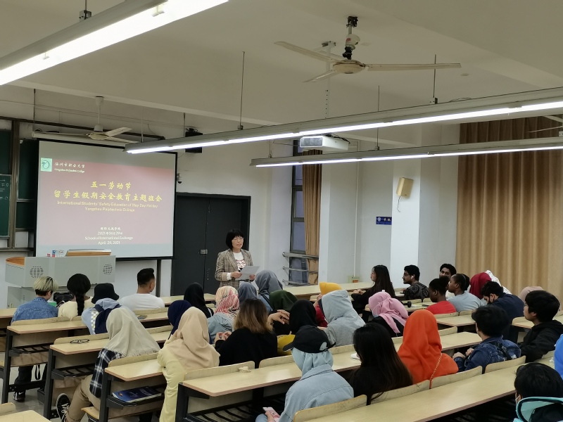 为进一步加强对在扬留学生的管理教育,让留学生掌握基本的安全常识,增强安全意识,“五一”小长假前夕(4月29日晚上),我校国际交流学院在知行楼C104召开了“五一”假期留学生安全教育主题班会。学院分管留学生工作副院长沐卫萍、相关留学生班主任及全体在扬留学生参加了安全教育主题班会。