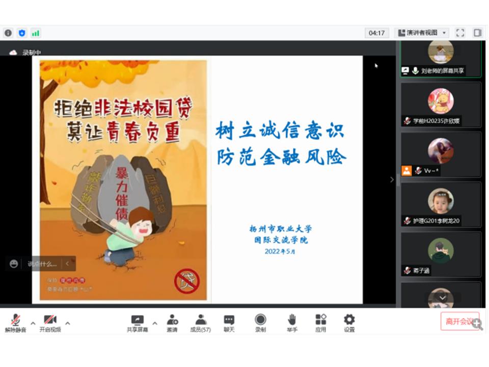 2022年5月27日晚,国际交流学院召开了“树立诚信意识,防范金融风险”讲座,参加此次讲座的有学院党总支副书记刘鎏书记,陆薇老师,学生会成员、贷款的学生以及各班受过学校资助的同学们。