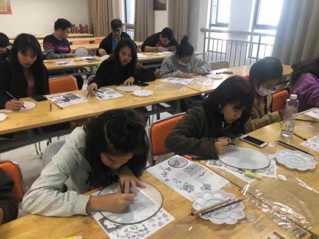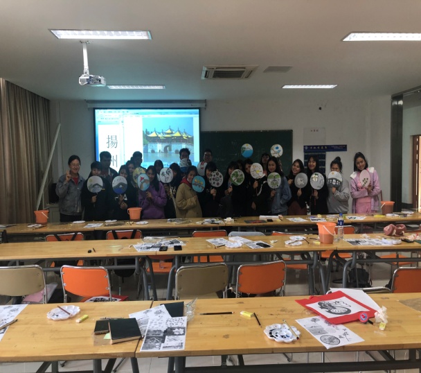 泰国研学团在我校的交流学习,可谓是多板块的!瞧!他们又零距离地感知、了解、体验了“中国文创产品设计”的魅力。艺术学院郭艺老师为营造充满艺术感的课堂氛围,对泰国研学团学生用心讲解团扇绘画的手法和技巧,将扬州特色景点瘦西湖元素融入精美的团扇绘画,每个同学都画出了不同的韵味,既锻炼了动手能力,又体验了中泰团扇绘画不同的设计风格。