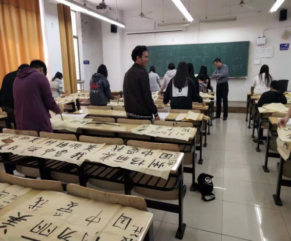 研学团同学在我校的中国文化体验还不止这些呢!他们在我校书法协会会员国交院王元明副院长的细心讲解下,又拿起了毛笔,练起了毛笔字,王院长耐心地教给他们初步掌握立式书法的要领、正确执笔的姿势和汉字笔法,结合黑板演示和举例详解,让异国的学生了解了中国汉字的渊源以及文化,同学们纷纷提起毛笔,跃跃欲试。在王老师手把手的指导下,他们尝试写下了人生中的首次毛笔字,一撇一捺、一横一竖……即便没有行云流水的运笔功力,也不妨碍来自异国的这群学生在尝试中深入体察中国书法的笔墨横姿的魅力,使泰国学生体验了一把中国书法,提高了文化修养。