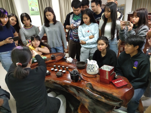 旅游学院的竹西茶社,泰国学生研学团在津津有味地体验中国茶文化。于海燕老师先用PPT讲解了中国茶文化的发展历史、中国名茶种类和产地、茶道与茶礼仪,然后向大家展示了中国功夫茶,泰国学生们用三指举杯、三口饮茶、三指叩桌以示感谢,将茶的礼仪贯彻于整个品尝过程中。