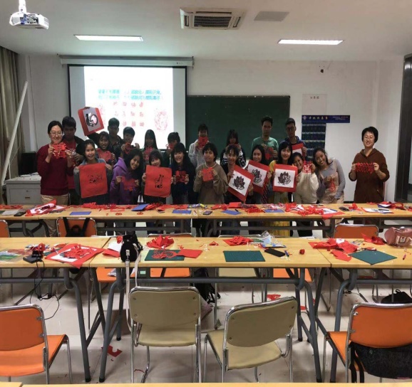 剪纸作为中国最为流行的民间艺术之一,有着悠久的历史,研学团在艺术学院大楼314教室,零距离地感受了这一传统艺术。看着陈皎月老师展示的一件件精美的剪纸工艺品,交流团师生们一下子很有兴致,在陈老师的耐心指导下,虽然是第一次动手剪纸,但他们很快找到了感觉,一刀一剪,一幅幅“囍”、“团花”、“抽花”和“属相”让他们惊喜不已,令他们对“指尖上的艺术”感到奇妙。