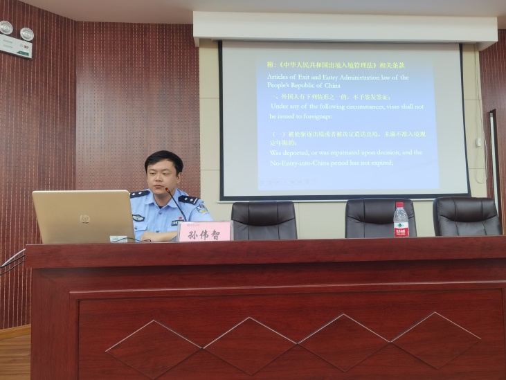 随后,由邗江区公安局出入境管理大队孙伟智警官从临时住宿登记、个人证件管理等方面进行留学生出入境法律法规的宣讲,并以近年扬州地区发生的非法案例作为警示,强调遵守涉外法律法规的重要性。