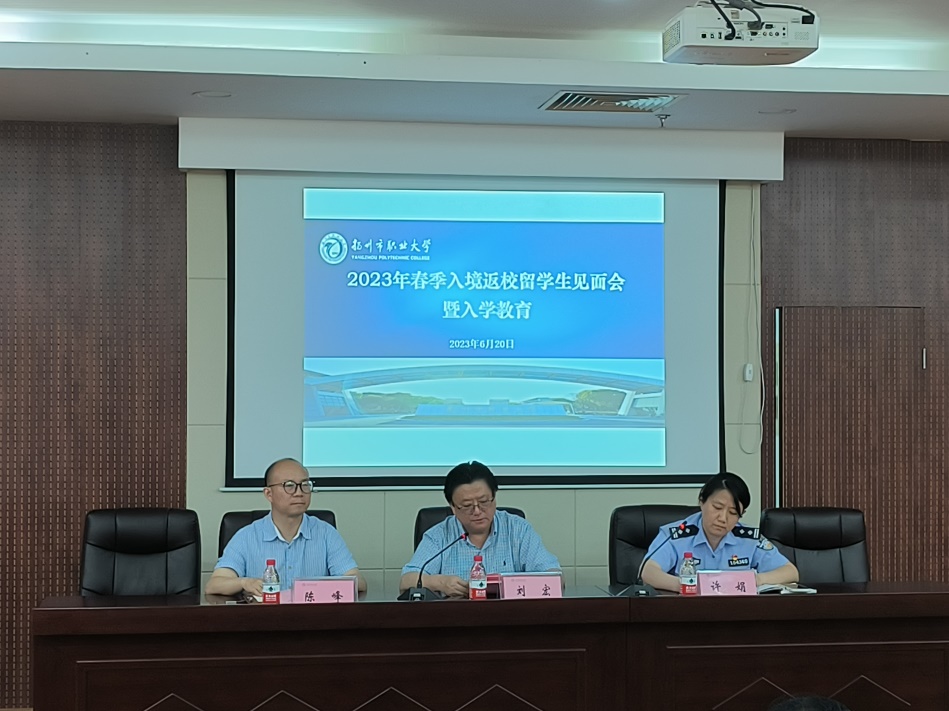 6月20日上午,国际交流学院组织开展来华留学生见面会暨入学教育,邗江区公安局出入境相关领导、副校长刘宏、国际交流合作处、学工处、后勤处、保卫处、国交院相关负责人及2023年春季返校的全体留学生参加会议。会议由国交院党总支书记陈峰主持。
