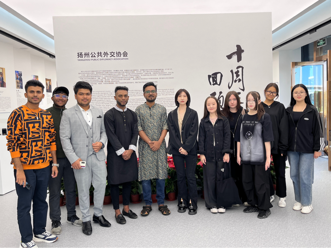 2023年10月20日下午,扬州公共外交协会成立十周年回顾展在生态科技新城1912小镇公共外交街区举办,我校留学生受邀参加。