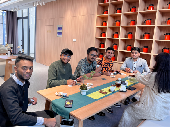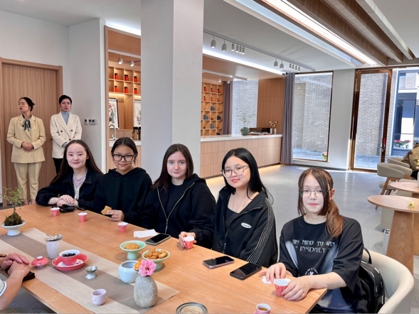 活动现场,在绵长悠远的古琴声中,学生们亲身参与“吃茶”,了解、欣赏和领悟茶的文化与意蕴。一方席,一张几,在“一茶一偈”文化体验空间的茶席之上,茶艺师一面向学生们展示中国传统茶文化的精湛表演,一面为同学们进行细致讲解。从温杯洁具到赏茶制茶,从润茶泡茶到斟茶奉茶,同学们被中华传统茶艺魅力所吸引,边观看、边品茗。来自巴基斯坦的张伟接过茶艺老师递来的第一杯茶,好奇地向老师请教茶叶的名称和由来。结合扬州历史,老师们介绍了“贵梅兰”、“一品广陵红”两款独具扬州文化魅力的茶叶品种。此次近距离体验中国茶文化,不仅为学生们带来了别开生面的茶文化体验,更在茶香唇齿间加深了大家对茶文化尤其是扬州特色茶文化的了解。