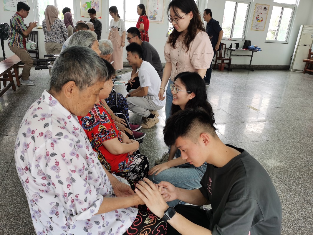 活动中,同学们有的陪老人聊天,有的为老人剪指甲,有的给老人按摩。“爷爷,您今年高寿?” 今年大一的周心竹同学一边给老人捶背一边问道。“我今年八十八啦。”老人微笑着一边伸手比划。来自印尼的留学生刘雅娜用不太熟练的中文问道:“奶奶,我可以给你梳头发吗?”陈奶奶笑呵呵地点头同意。国际交流学院老师还当场为老人们在扇面作中国画,送去清凉,也送上美好的祝福。此外,中外同学们还分别表演了文艺节目,给老人们的生活增添乐趣。