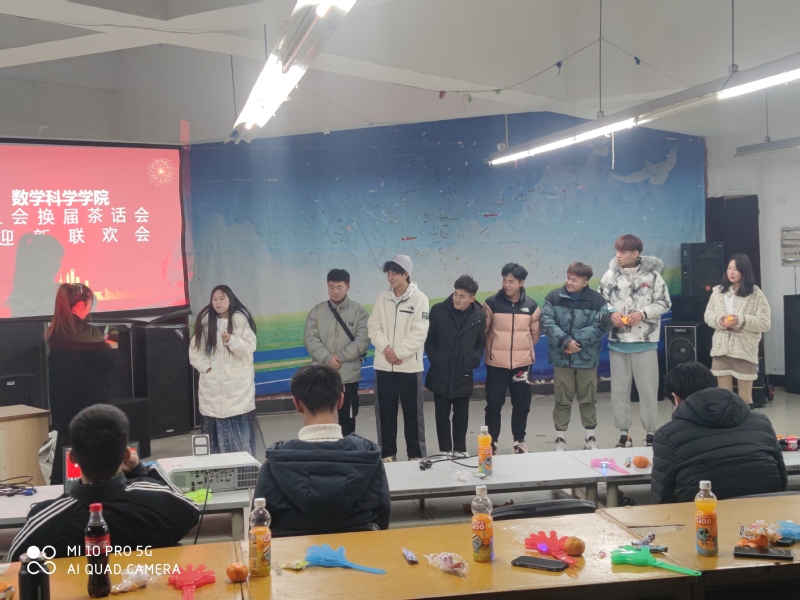 2020年12月18日,数学科学学院学生会换届茶话会暨迎新联欢活动在知行楼D101隆重举行,学工办主任李老师和统计2001班班主任张老师如约而至,整个会场热闹非凡。对于刚进大一的我们来说,这是一次重大的活动,现场节目种类繁多,有舞蹈、话剧、美声等等,无不显示我们对上一届学生会学长学姐的深深留念和祝福。所有分项目活动大家都积极参加,抢椅子、“谁是卧底”、夹乒乓球的活动,大家都热情高涨,现场尖叫声、拍手声此起彼伏,就连一直以严肃文明的李老师都露出来温暖无比的笑容。