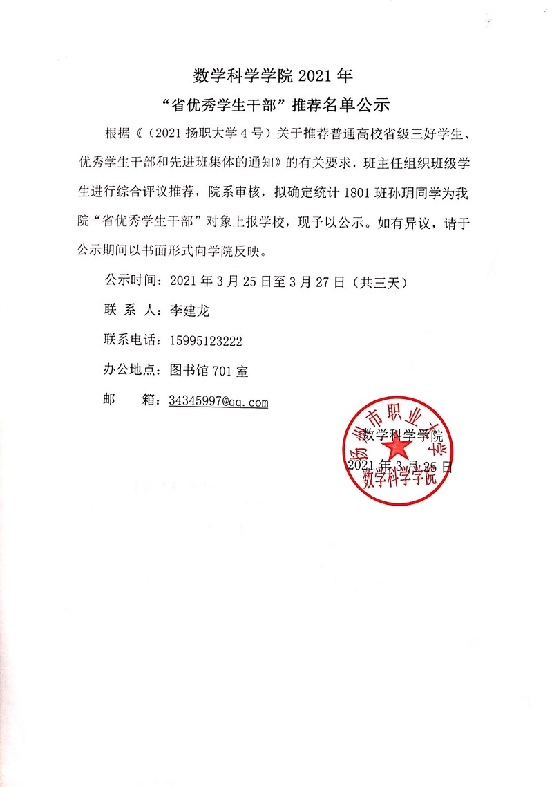 数学科学学院2021年“省优秀学生干部”推荐名单公示