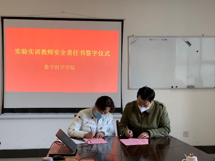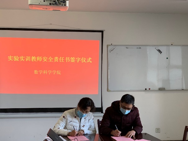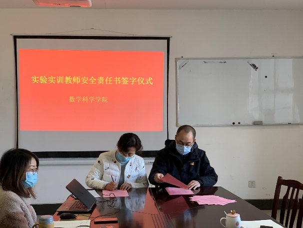 为切实落实安全责任体系建设工作,切实保障实验室安全,预防安全事故发生,2021年12月1日下午,我院举行了实验室安全责任书签订仪式。由周晓副院长分别与实验实训室(中心)主任、学工办主任及各专任教师签订了《数学科学学院实验实训室(中心)主任安全责任书》、《数学科学学院实验实训室管理人员安全责任书》等。通过层层签订责任书的形式,进一步明确责任、压实责任,确保实验室安全工作万无一失。