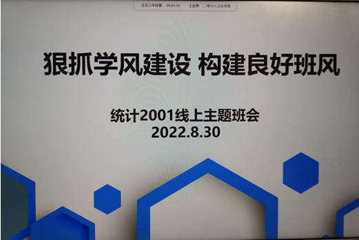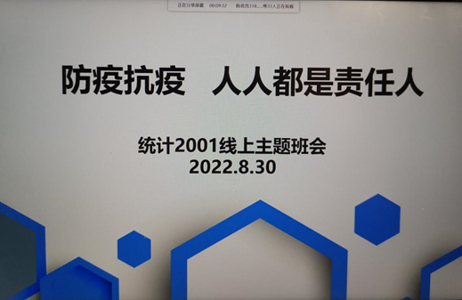为落实立德树人根本任务,牢抓学院学风建设工作,提高当代大学生的疫情防控意识,8月30日晚7点,数学科学学院统计2001班在线召开了“学风建设”和“疫情防控全员教育”的主题班会,全体同学线上参会。