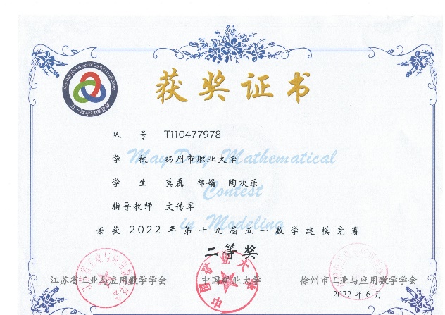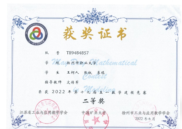 五一杯”大学生数学建模竞赛是一项大学生自发组织的全国性数模竞赛,中科院院士李大潜为该项联赛题词、中国教育电视台两次专题报道。该赛事竞赛题目主要由工程技术、经济管理、社会生活等领域中的实际问题简化加工而成,没有事先设定的标准答案,留有充分余地供参赛者发挥其聪明才智。本次比赛吸引了来自国内200余所高校的6648队选手报名参赛,其中5825队选手提交有效论文。通过本次竞赛,提高了学生解决实际问题、逻辑思维、论文写作、团队合作、创新等方面的能力,为我校2022年全国大学生数学建模竞赛取得好成绩奠定了基础。