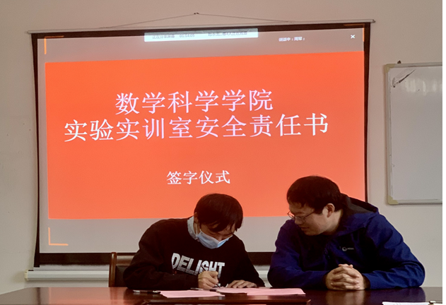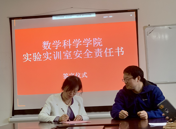 随后,周晓副院长、实验实训中心张生华主任、实验室管理员姜道旭、统计专业教师代表王晓刚老师,通过签订2022-2023学年《数学科学学院实验实训室(中心)主任安全责任书》、《数学科学学院实验实训室管理人员安全责任书》的形式,进一步提高责任意识、明确了管理责任,为营造良好的校园安全和实验实训环境提供了制度保证。