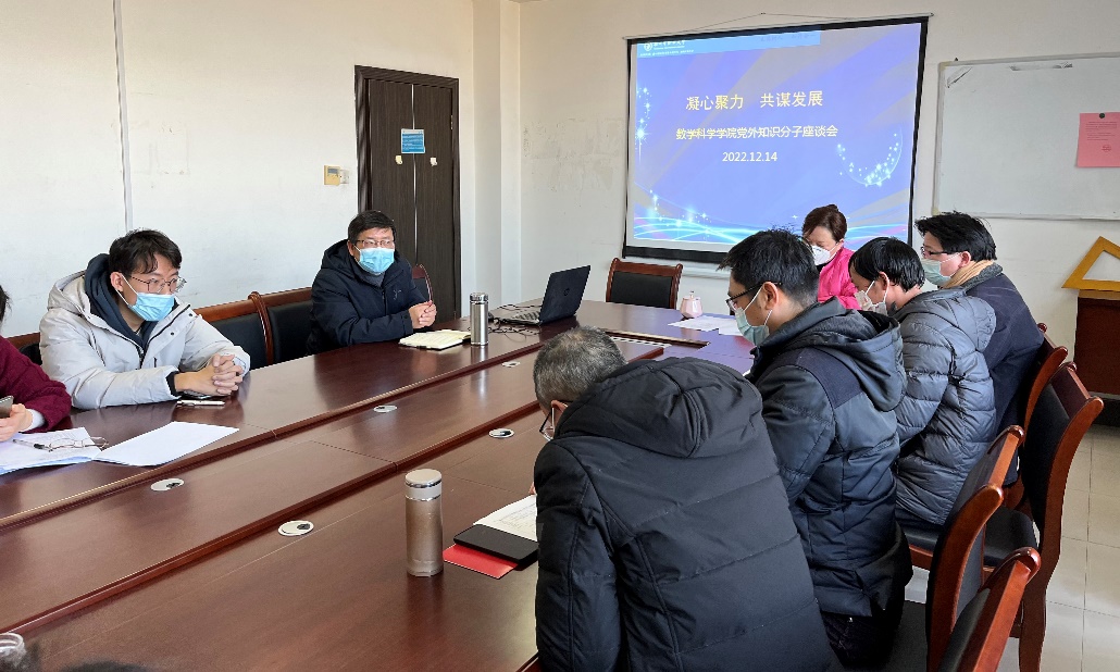 为凝聚共识,进一步激发党外知识分子推动学院高质量内涵发展的积极性和主动性,数学科学学院于2022年12月14日下午,在图书馆会议室718召开了“凝心聚力 共谋发展”为主题的党外知识分子座谈会。本次会议由党总支书记周军主持,学院党政班子、二级机构负责人、全体党外教师参会。