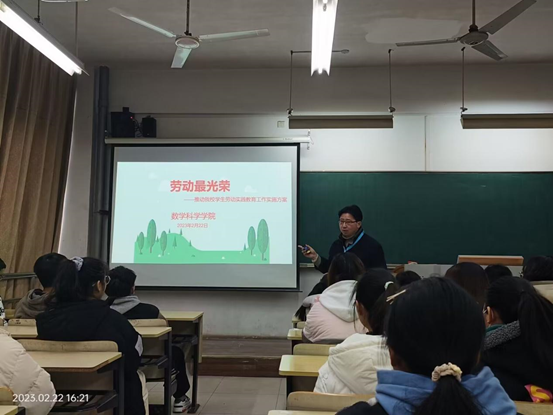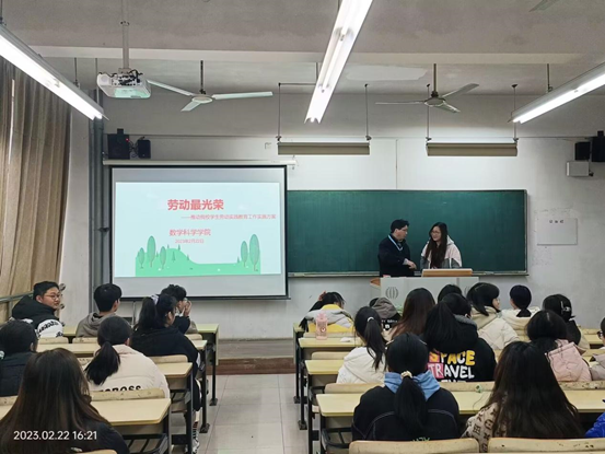 为深入贯彻落实全国教育大会以及《中共中央国务院关于全面加强新时代大中小学生劳动教育的意见》相关文件精神,增强学生劳动教育理念,培养学生积极劳动的精神,全面提升学生劳动素养,2023年2月22日下午,数学科学学院统计2201班组织开展了以“劳动最光荣”为主题的团日活动。本次活动由班主任文传军老师主持,统计2201班全体学生参加。