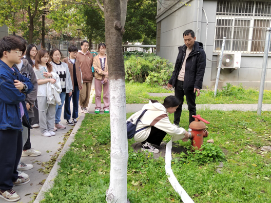 演练开始前,王正军科长先组织学生进行了消防知识培训,传授了着火时如何自救、如何灭火等消防安全知识,让大家进一步掌握火灾来临的自救方法和扑救方法。活动中,王科长详细讲解了灭火器和消火栓的使用方法,现场演示如何正确使用灭火器,判断风向进行灭火,并鼓励全班学生进行实际操作。通过模拟灭火的实践,学生们对灭火器的使用、消防栓水管的组装、水枪灭火等消防安全知识有了更加深刻的理解。