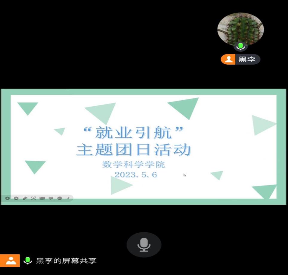 为引导大学生树立正确的就业观念,提升就业竞争力,推动毕业生高质量就业,5月6日,数学科学学院2020级和2022级团支部开展“就业引航”主题团日活动。考虑到有些师生因故无法返校,所以本次活动在线上线下同时进行。