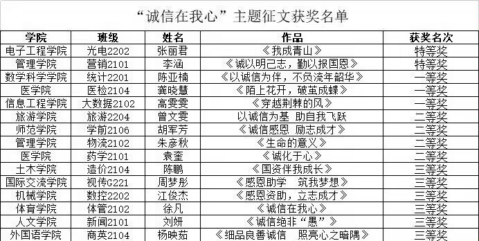 数学科学学院高度重视,积极响应,广泛动员全院学生参与,各班级择优推荐,经过学院内部评比、学校评审,我院统计2201班陈亚楠同学的作品《以诚信为伴,不负流年韶华》获得了校一等奖的好成绩。