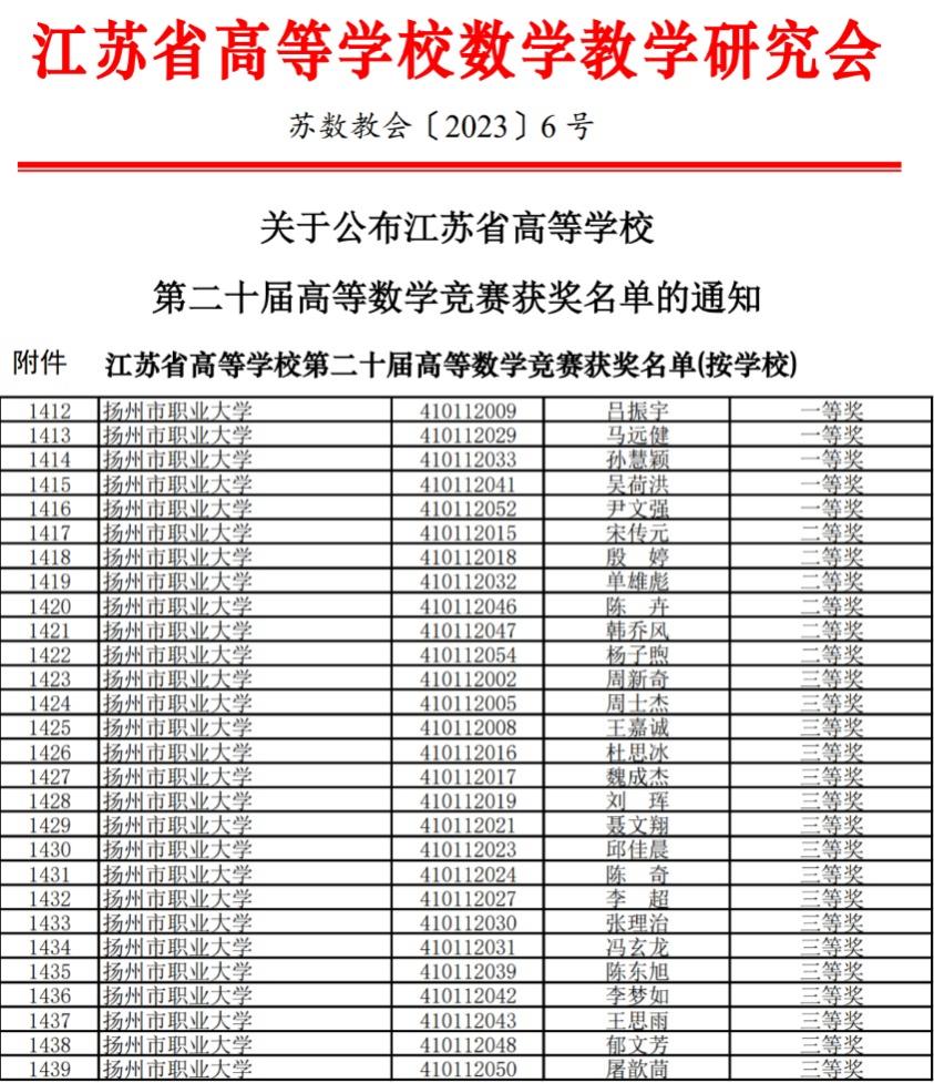 我校学生在2023年江苏省第二十届高等数学竞赛中再创佳绩