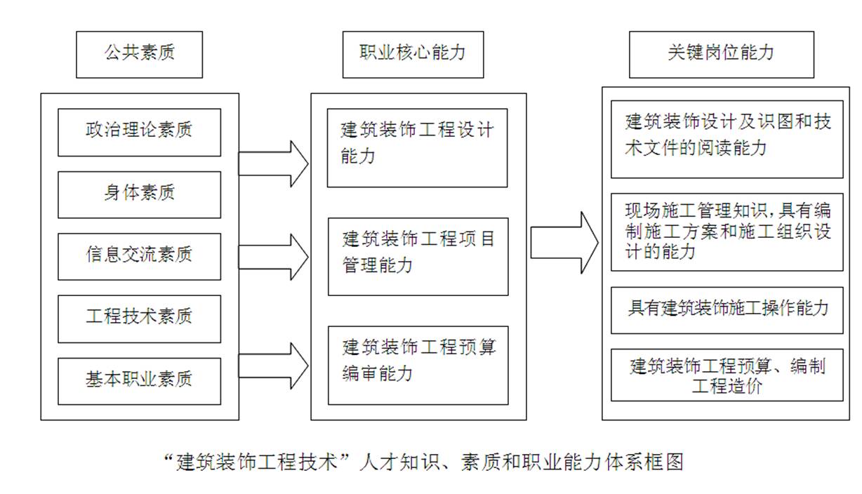 本专业培养德智体美全面发展的,掌握建筑装饰工程技术专业所必需的基础理论知识的,具备设计施工基本技能的,能在建筑施工单位、装饰工程公司、房地产开发公司等企业,主要从事建筑装饰的设计、施工、监理工作及与之相关的管理工作的高素质技能型专门人才。