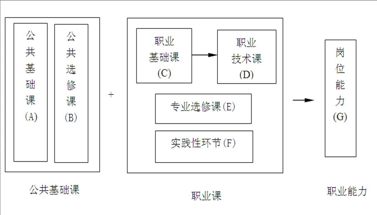 注:图中公共基础课(A)的课程主要有高等数学、英语、体育、思想政治等;公共选修课(B)的课程主要有音乐欣赏、绘画艺术、心理素质教育、形体艺术等,职业基础课(C)的课程主要有工程数学、工程力学、结构设计原理等,职业技术课(D)的课程主要有道路工程制图、道路勘测设计、桥梁工程、路基路面工程等,专业选修课(E)的课程主要有道路工程测量、道路建筑材料、桥梁施工、公路施工组织与概预算、市政工程、交通工程等,实践性环节(F)包括认识实习、实验实训教学、生产实习、毕业实习及课程设计、毕业设计等,岗位能力(G)即培养目标有道路桥梁现场施工技术管理、现场放线、工程实验、道路桥梁工程概预算等方面的工程应用能力。