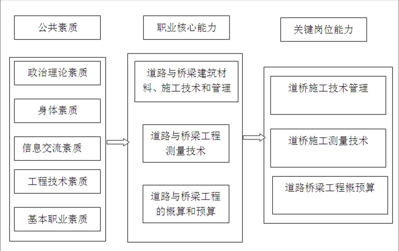 素质结构包括人的思想道德修养、文化科学知识、身心健康状况、审美观点和劳动技能水平等。具体有:务实精神,拼搏精神,善于学习和创造,合作意识和协调能力等。具体到道路与桥梁工程技术专业,职业能力体系如下: