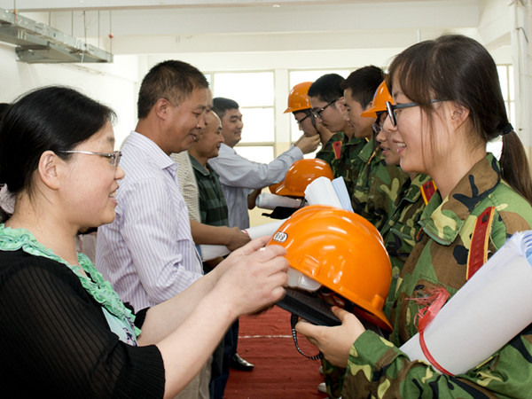 在欢迎会上最引人注目的环节莫过于向新生“送礼”环节,一是给每个专业的学生送上了《专业学习规划》,把每个学期要掌握的知识、技能以及掌握知识技能的途径都写在了里面,二是送给每一位学生一顶安全帽,让土木专业的学生在进校之初就牢固树立安全意识,三是送给每一位学生一套设计工程图纸和制图工具,设计图纸都是真实案例,强化学生专业基本技能培养。伴着激昂乐声的奏起,新生欢迎会的授帽仪式将本次活动推向高潮,全体新生庄严起立,在领导老师细心的指导下,郑重的带上了自己职业象征的安全帽。此后,教师代表尹继明、老生代表对专业学习与新生活进行了讲解。新生代表李坤,以超出山东本二线58分的自信的向新同学表达了他对未来的畅想及规划,并激励大家:男儿立志出乡关,学不成名誓不还!
