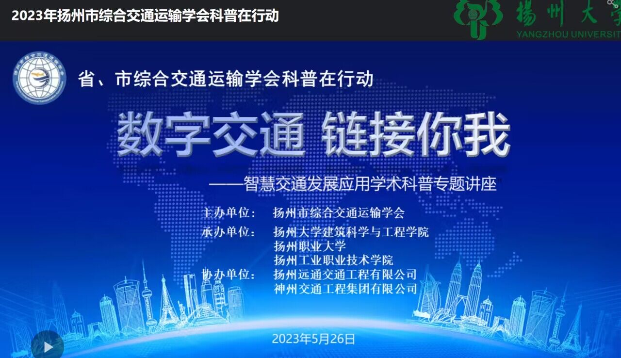 为了提高职业教育能力,开阔师生视野,了解和掌握行业发展前沿最新动态,按照我校职业教育活动周安排,5月26日下午,betway必威中文版 土木工程学院作为分会场,参加了由扬州市综合交通运输学会主办,扬州大学建筑科学与工程学院、betway必威中文版 和扬州工业职业技术学院承办的“数字交通链接你我——智慧交通发展应用学术科普专题讲座”。本次讲座邀请了东南大学教授刘志远和神州交通工程集团有限公司副总经理于有军两位专家,分别从理论和实践的角度,介绍了智慧交通的定义、特点、发展与展望以及雄安新区的智慧交通实践案例。讲座内容丰富、深入浅出,受到了参会的教师和同学们的一致好评。