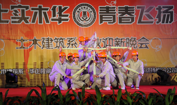 金秋十月是扬起希望和梦想的风帆远航的季节,带着对大学生活的向往,10月31日晚6:30,土木建筑系迎来了期待已久的2011级金秋迎新晚会。校领导张网女、许金如、刘建伟,各部门负责人、院(系)党总支书记,扬建集团副总经理邹厚存等领导和嘉宾出席了晚会。青春的舞步,动感的音乐,诙谐的话剧,叫好声此起彼伏,掌声阵阵。