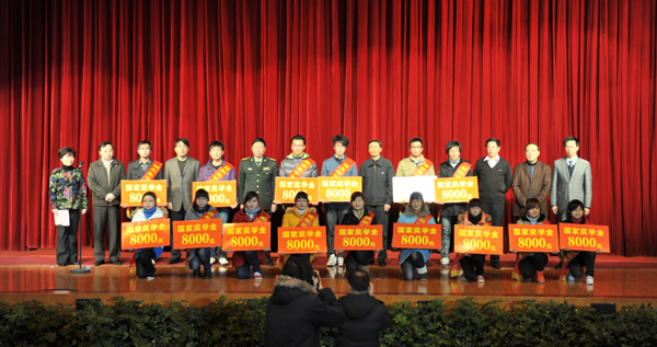 开幕式由党委书记张网女主持,校长周胜教授致开幕词,扬州市人民政府副市长董玉海做了重要讲话。党委副书记许金如宣读了国家奖学金获得者名单,市领导为18名获得国家奖学金的同学进行了颁奖。