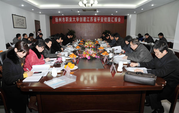 2月27日下午,由南京大学保卫处长戴长顺任组长、苏州大学保卫处长霍跃进和淮阴师范学院保卫处长陆林召一行三人组成的检查组,对我校创建“江苏省平安校园”进行了全面检查。扬州市委教工委副书记何明华、扬州市公安局党委副书记杭建强、扬州市综合办副主任兰建华、扬州市公安局内保支队长吴伟、扬州市教育局高教处副处长陈珊银,学校领导张网女、周胜、许金如、刘宏,以及相关部门负责人参加了汇报会。