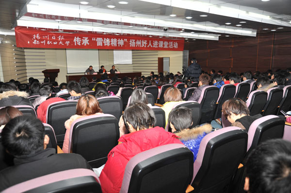 3月1日,我校邀请“扬州好人”李彬在315报告厅举行传承雷锋精神----“扬州好人”进课堂活动,机械工程学院、校报记者团的200多名同学参加了活动。李彬一个小时的激情演讲,获得同学们8次雷霆般的掌声。报告会由宣传处副处长房士坤主持。