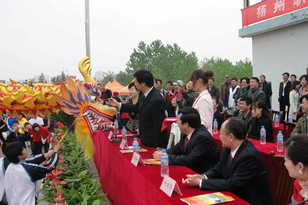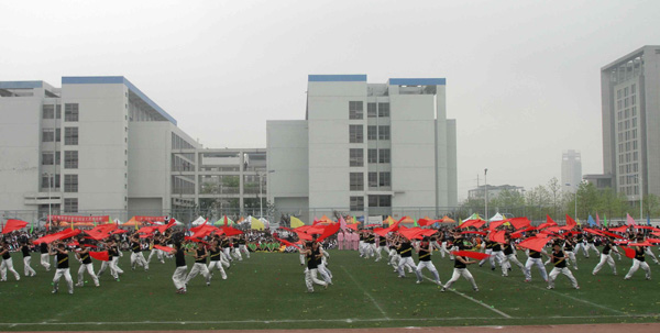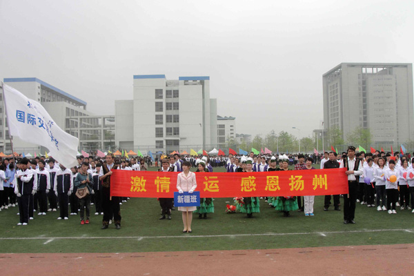 在雄赳赳的进行曲中, 新疆班的学员打着“激情校运,感恩扬州”的横幅,斗志昂扬地走过主席台;神采飞扬的体育系女子代表队身着粉红色太极服,尽显“巾帼不让须眉”的英姿飒爽;机械工程学院的代表,一边挥舞彩条,一边吹响手中的小喇叭,体现了青春的不拘一格。