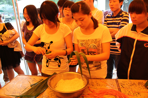 活动的重头戏是包粽子比赛,吸引了全校所有院(系)代表队报名参与。比赛中,同学们兴致勃勃,有技巧娴熟的能手,也有小心翼翼的新手。有些队伍短短的十几分钟就包出了几十个粽子,而且整齐漂亮,围观的同学纷纷赞叹。校领导王如平,学生处、团委负责人和院(系)总支书记等参加了活动。部分院(系)领导还亲自参与,与同学协作,其乐融融。最后,数学系代表队以所包粽子多、质量好夺得第一名。