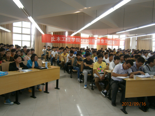 9月16日上午,2012级新生报到的第二天,土木工程学院利用体检安排的间隙,在实验楼D201和D301分别举行了新生欢迎会暨新生入学专业教育。会议由院行政负责人王欣主持,学院党务召集人雷永贵、行政召集人吴书安、行政负责人吕凡任、洪波以及院全体中层、2012级新生班主任出席了会议。校科技产业处行政召集人王思源、院原党总支书记华常春作为优秀教师代表、资深专家出席会议并做讲话。