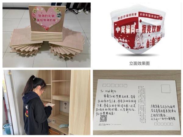 机械工程学院为35名成绩优异的家庭困难新生代表送上神秘的专属定制礼包——机械制图板,嘱托新生炼就专业技能,创造美好前程;艺术学院师生应扬州市公安局新盛派出所邀请,通过最接地气的方式把反诈宣传图片设计在口罩上,提醒新生冷静思考,提高防范意识;师范学院教师和学长学姐购买了扬州风光手绘明信片并手写祝福,为新生送上“爱的明信片”,寄语新生珍惜青春岁月,实现自我价值;医学院为当天过生日的新生送出《习近平与大学生朋友们》和定制U盘,U盘内提前准备了学院拍摄的“红医精神代代传”党史学习教育主题微视频,记录了学长学姐们寻访身边老红医的故事,引导新生传承红色基因,担当强国使命。