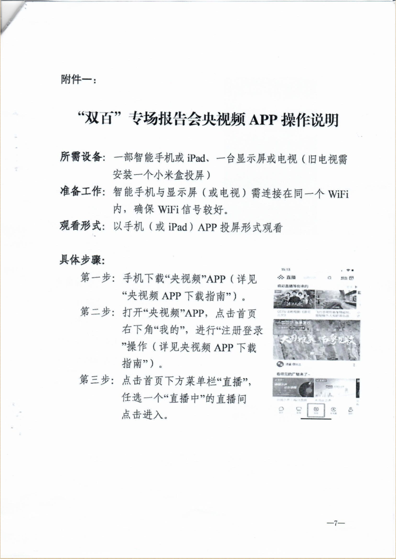 下载央视频APP,登录主页“2022年‘双百’活动中央和国家机关专场报告会”专题页面,收看专场报告会直播。央视频为移动端APP,无电脑版,仅能使用手机或IPAD自行或投屏观看。(具体操作说明见附件)