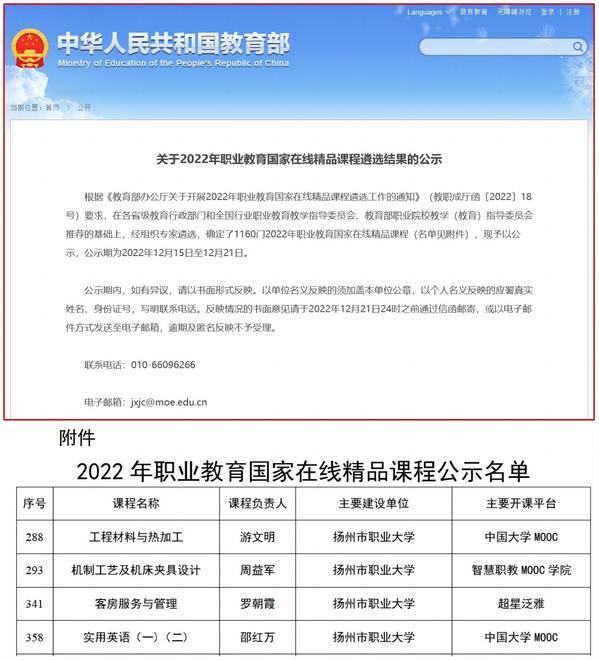近日,教育部公示了2022年职业教育国家在线精品课程遴选结果,我校游文明教授的《工程材料与热加工》、邵红万教授的《实用英语(一)(二)》、周益军教授的《机制工艺及机床夹具设计》、罗朝霞副教授的《客房服务与管理》等4门课程入选,这是我校在“双高”建设中取得的又一标志性成果。