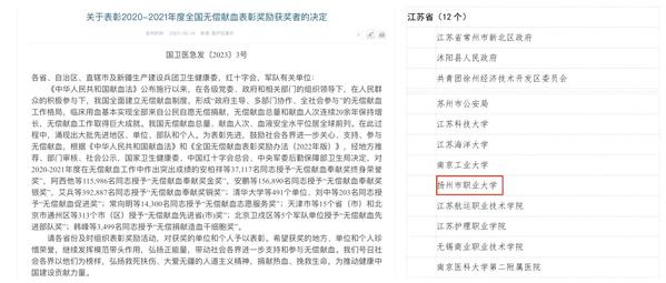 近日,国家卫生健康委员会、中国红十字会总会与中央军委后勤保障部卫生局联合下发了《关于表彰2020-2021年度全国无偿献血表彰奖励获奖者的决定》,我校荣获“全国无偿献血促进奖单位奖”,是江苏省获此项荣誉的12个单位之一。