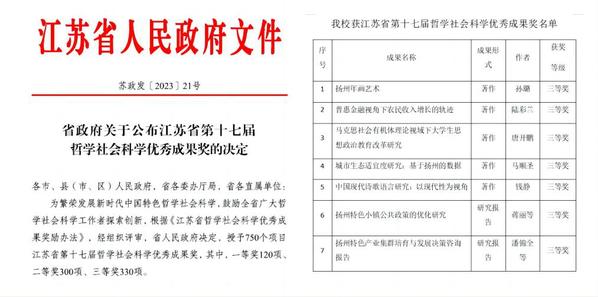 江苏省哲学社会科学优秀成果奖是由省人民政府设立的我省哲学社会科学界规格最高的政府奖,每两年评选一次。该奖项对彰显学校哲学社会科学研究水平,激励广大社科工作者加强理论创新,促进优秀科研成不断涌现,推动构建中国特色哲学社会科学学科体系、学术体系、话语体系具有重要意义。