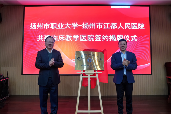 3月30日上午,我校与江都人民医院共建临床教学医院签约揭牌仪式在江都人民医院举行。学校党委书记马顺圣,党委副书记、校长林刚,江都区区委副书记、区长朱定金,扬州市卫生健康委员会副主任缪彦,江都区副区长、江都人民医院院长陆德川以及校、院有关单位负责人参加了签约揭牌仪式。